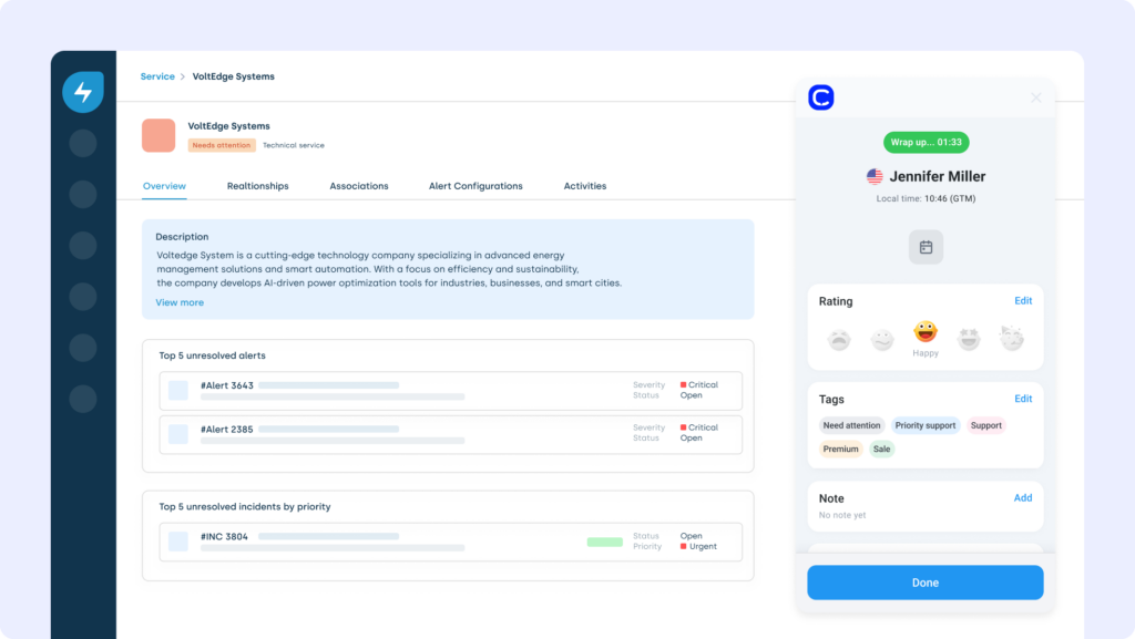 Synkronisera samtalsloggar, visa interaktionshistorik för kunder, tilldela samtal till rätt agenter och få tillgång till detaljerade insikter för att förbättra svarstider och effektivitet. Förbättra IT-supportverksamheten med sömlösa funktioner för telefoni och datadrivna beslut.