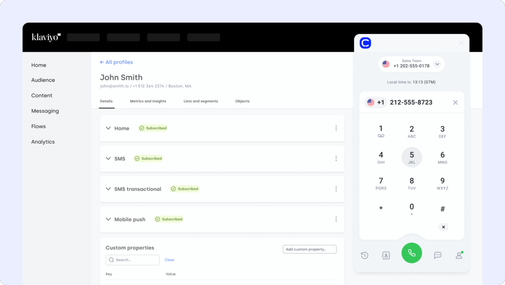 Klaviyo är inte ett fullständigt CRM-system, men Klaviyo CRM-integrationen med CloudTalk lägger till verktyg för kontaktsynkronisering, samtalsloggning och profilberikning.