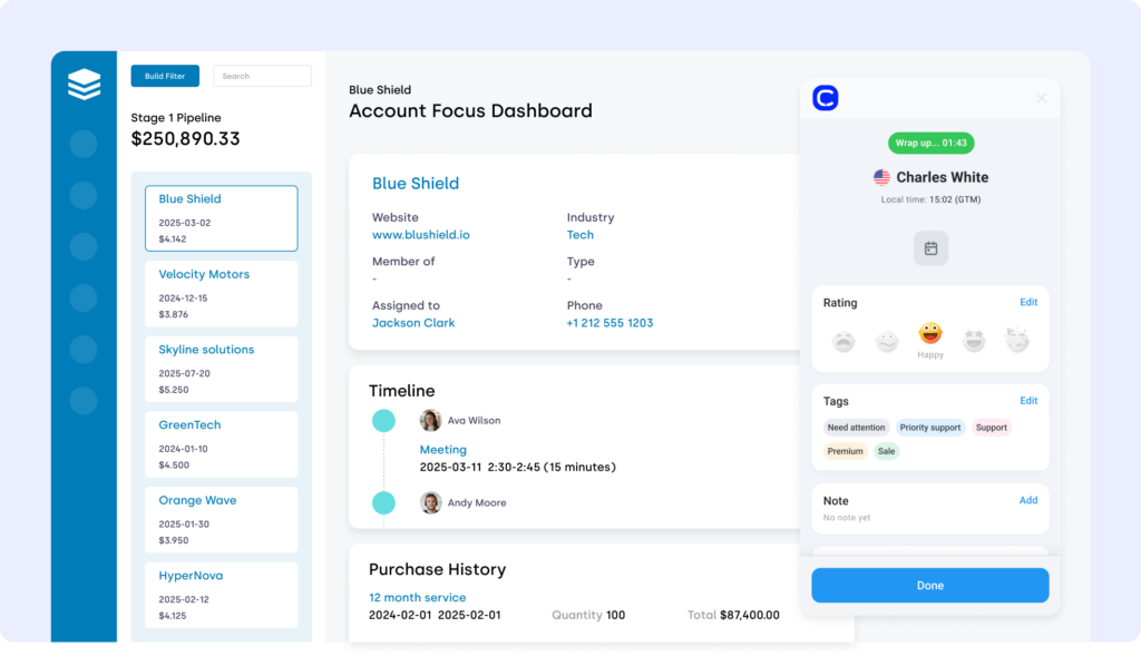 Håll ditt team datadrivet och effektivt med omfattande samtalsinsikter, automatiserade arbetsflöden och AI-drivna analyser som förbättrar engagemanget hos kunderna. Logga enkelt varje samtal, spåra samtalsresultat, spela upp röstmeddelanden och övervaka prestanda.