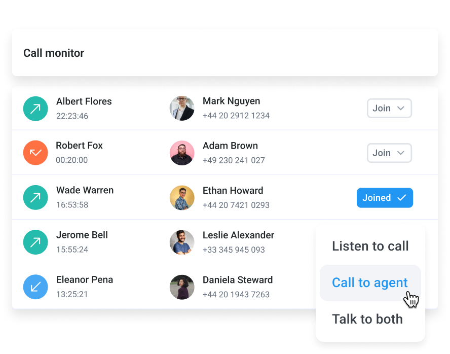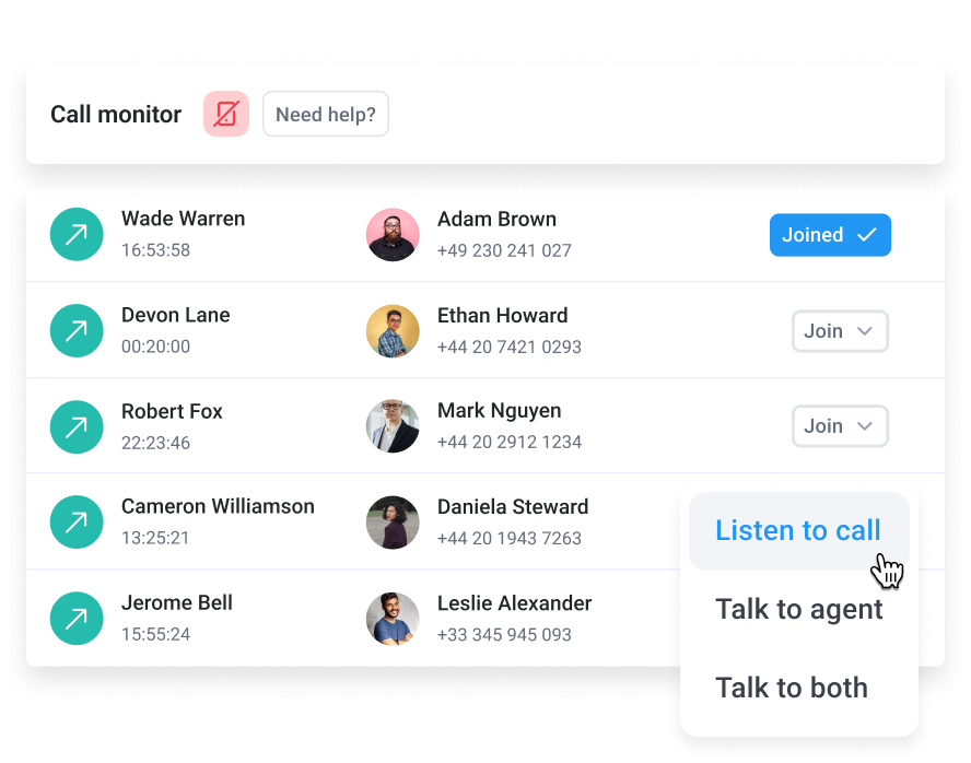 借助呼叫監控,您可以輕鬆監督座席和客戶之間正在進行的對話。 它允許您透過儀錶板上的「呼叫監視器」選項卡訪問即時通話清單。 CloudTalk 還允許您按呼叫持續時間、座席、座席組、方向或呼叫標籤進行篩選,以實現最高效率。