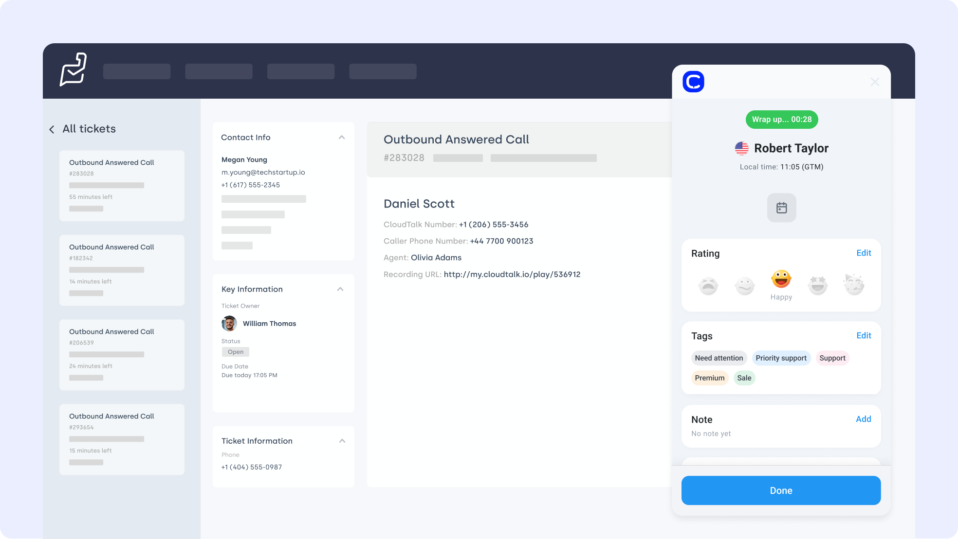This integration allows you to log calls directly into tickets, automate workflows, and keep all customer data up-to-date. To use it, simply activate the integration through your CloudTalk dashboard, authenticate your Zoho Desk account, and configure synchronization settings.